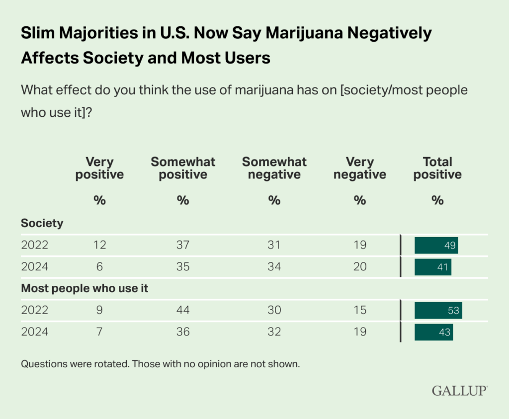 In general, the poll found that slim majorities of respondents believe marijuana has a negative effect on society (54 percent) and consumers (51 percent), which represents a slight uptick compared to 2022.