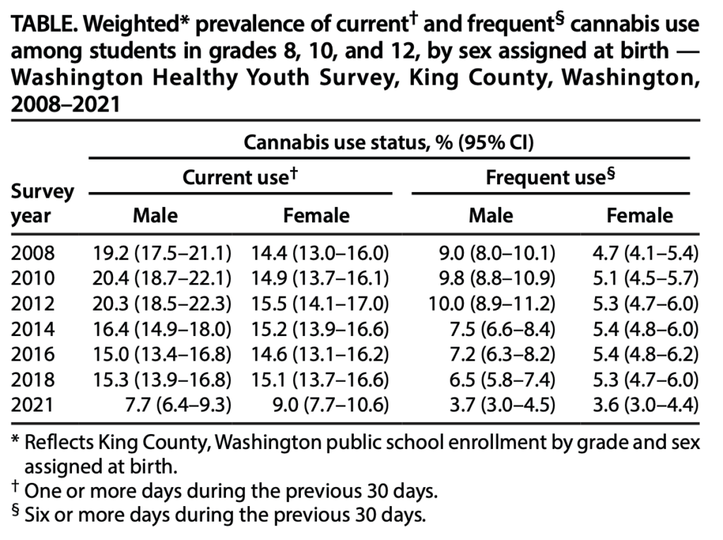 According to the study, published in CDC’s latest Morbidity and Mortality Weekly Report, current and frequent use of marijuana among teens in King County has fallen significantly since state voters legalized adult-use cannabis by initiative in November 2012.