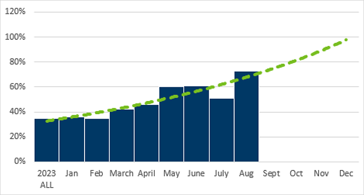 The chart above shows the percentage of inspections for hemp-derived cannabis products that resulted in a business being compliant with state regulations. Minnesota Office of Cannabis Management / MinnPost