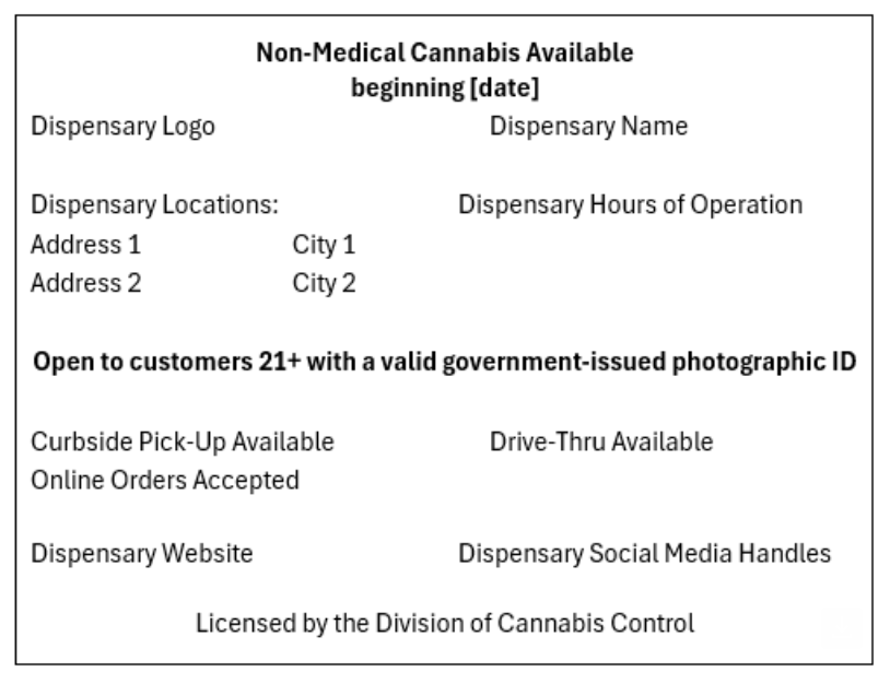 Advertising material for dual licensees may include the opening date, approved dispensary name, dispensary logo, a note about adults 21 years being allowed to access the shop, location and hours of operation, the business website and social media handles and information about whether online orders, drive-thru services and curbside pickup are available.
